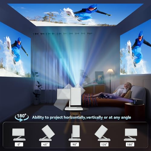 - 【Unique Foldable Stand】The movie projector comes with an adjustable stand that allows you to easily project onto walls or ceilings, enabling you to watch movies at any angle. The projector also has a 180° swivel design and height adjustment function. This means you can enjoy films comfortably whether sitting or lying down. (The projection distance is 1.2 to 4 meters and the projection size is 40 to 130 inches.)