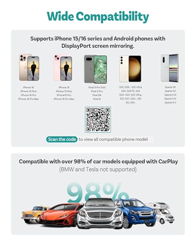 - Compatible with Future‑Proof Smartphones: Designed for the latest technology, Mirror Touch supports iOS flagship models from the iPhone 15 series onward and Android flagship models that support screen mirroring. Whether you own the newest Apple device or a Samsung flagship, you can enjoy seamless mirroring and wireless CarPlay in one device. (Requires a wired CarPlay‑compatible car head unit.)