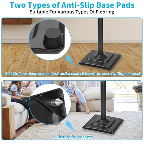 - 【Dual Interchangeable Floor Protectors】Our bookshelf speaker stands come with both spiked metal feet for carpet stability and non-slip rubber pads for hard floors (wood/tile/concrete). Our premium alloy steel construction prevents scratches while keeping your speakers rock-steady during playback.
