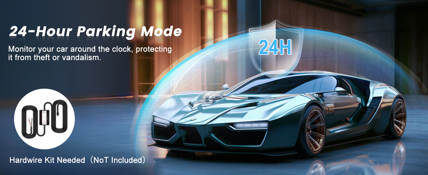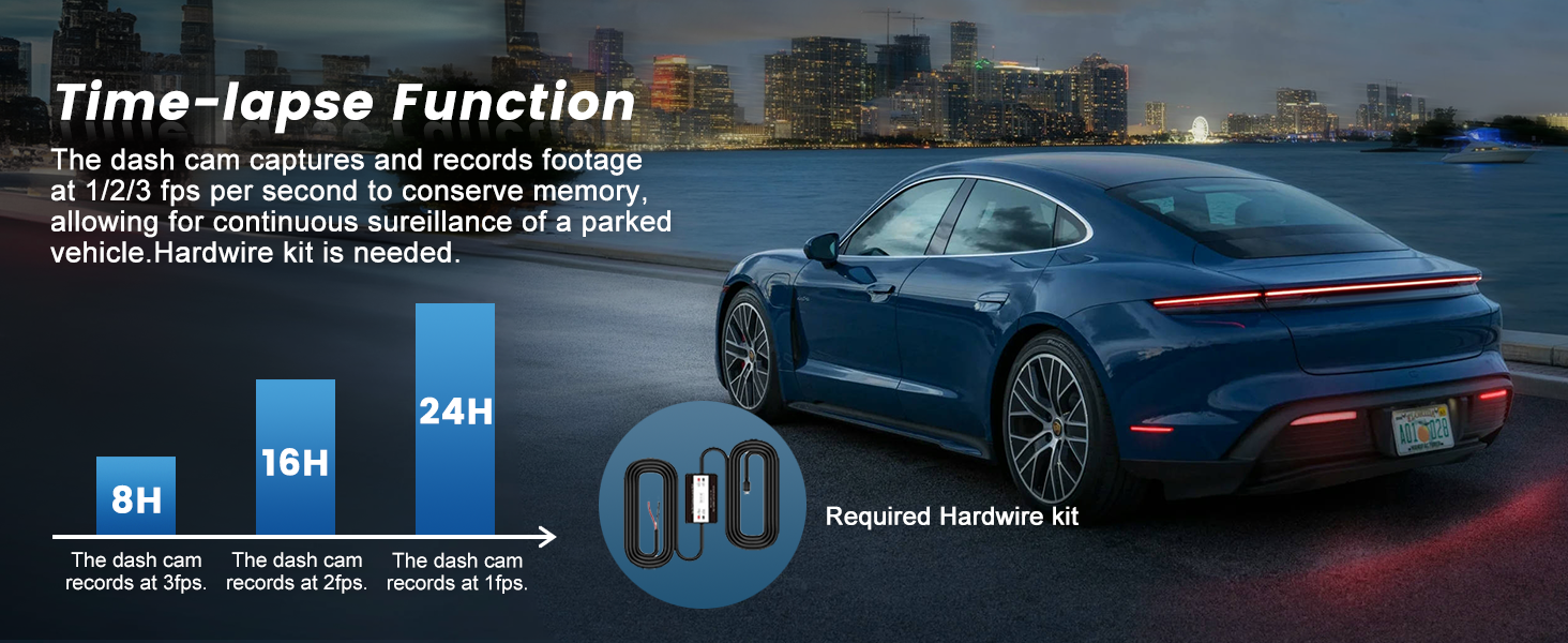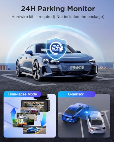 - ★【24H Parking Mode Dashcams & Time-lapse Function】This 2 channel car camera dash cam automatically switches to parking mode when your car is parked, ensuring continuous monitoring 7*24 hours.(Hardwire kit required, NOT included). The dashcams’ time-lapse feature compresses long videos into short ones, capturing and recording video at 1/2/3 frames per second to save memory card space for 7*24 hour surveillance.(Hardwire kit required, not included, let us know if you need one.)