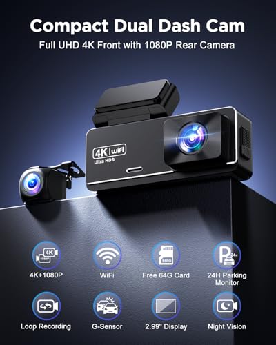 PENEMAY Dash Cam Front and Rear 4K+1080P, Dash Cam with Free 64GB SD Card, 2.99” IPS WiFi Dashcam, Superb Night Vision Dash Camera for Cars, 24H Parking Mode, G-Sensor, Loop Recording Car Camera