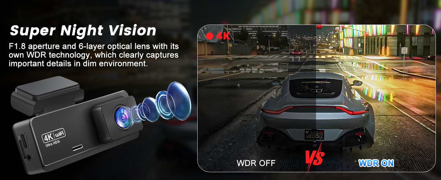 - ★【Outstanding Night Vision Car Dash Cam】Mini Dual dash cam with WDR technology enhances visibility and recording quality in low-light or nighttime conditions. It also uses features like infrared (IR) filters or enhanced low-light sensitivity to provide a clearer picture in dimly lit areas, such as poorly lit streets or when driving at night. The car on-dash mounted cameras captures UHD 4K video, providing crisp, clear images with four times the resolution of standard HD. This is particularly useful for identifying details like license plates, road signs, and other critical information during nighttime driving.