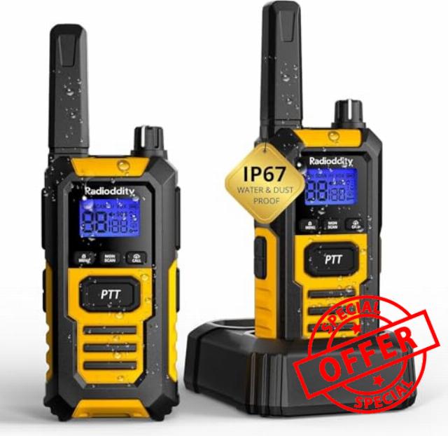 - Waterproof & Stays Afloat: Don't worry about rain, spills or dusty conditions. With the IP67 rating, these radios are fully waterproof (submersible up to 1m for 30 minutes) and completely dustproof. If dropped in water, they'll float, making them perfect for boating, kayaking, or any work near water