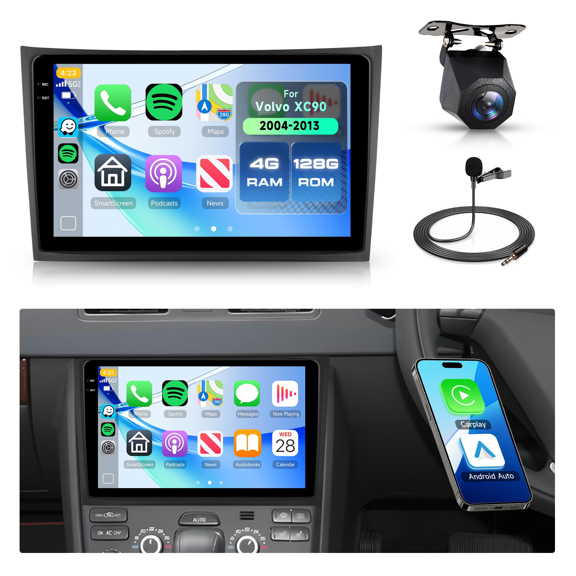 Rimoody 4G 128G Android Car Radio for Volvo XC90 2004-2013 10'' In-Cell Touch Screen Car Stereo with Wireless CarPlay Android Auto GPS/Bluetooth 5.0/FM RDS/EQ/Wi-Fi/Mirror Link/AHD Backup Camera
