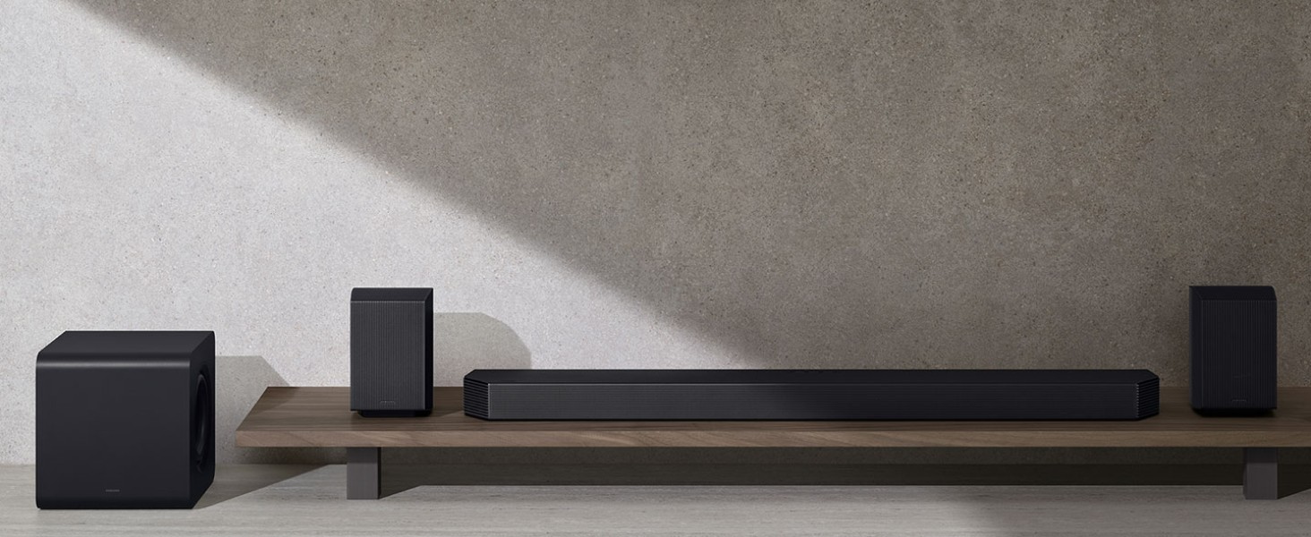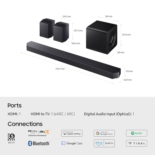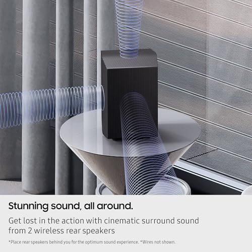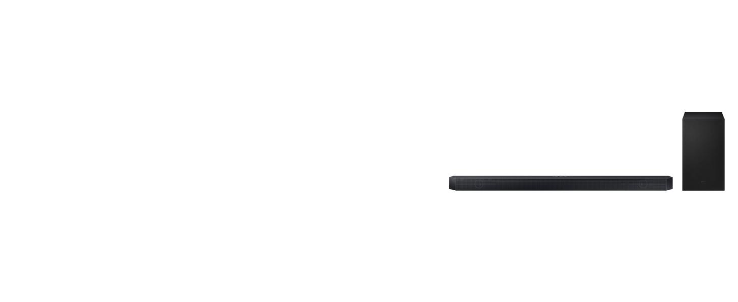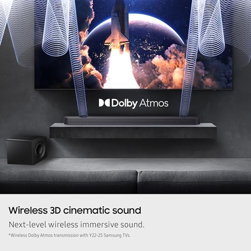 ¹9.1.4ch (9 front and surround channels, 1 subwoofer channel, 4 up-firing channels). 6.5” active unit and 8” passive radiator-applied wireless subwoofer included. 2.0.2ch wireless up-firing rear speaker kit included. ² Wireless Dolby Atmos transmission via Wi-Fi, works with 2022-2025 Samsung TVs. Dolby Atmos source content required. ³ Q-Symphony requires a compatible 2022-2025 Samsung TV (BU8000 and above for 2022 models, CU7000 and above for 2023 models, DU7000 and above for 2024 models, U8000F and above for 2025 models, and 2022-2025 models of The Frame). ⁴Sound optimization in Samsung Gaming Hub may vary by region and TV model. ⁵Game console sold separately. Compatible devices may vary. ⁶Available on Bluetooth Compatible TVs