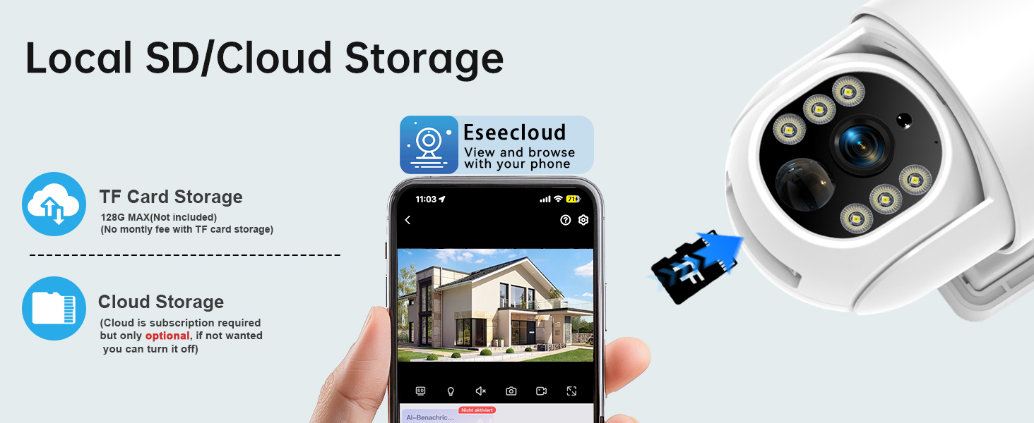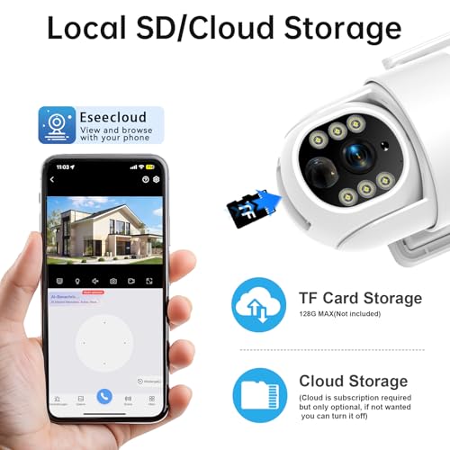 - 【Secure Local TF Card/Cloud Storage, Remote control on Mobile Phone】The wireless cameras for home security support local SD card and cloud storage. The solar power camera outdoor wireless support micro SD card (also called TF card, size 11*15mm, class 10, 4-bit, FAT32, 128G MAX), record and save videos on local TF card without subscription; Or you can subscribe cloud for storage(cloud subscription is only optional). you can connect multiple solar wifi camera outdoor wireless to Eseecloud APP and share with family/friends. camara solar 360 exterior support remote view and control anywhere anytime on mobile phone. The solar powered security camera works with Alexa