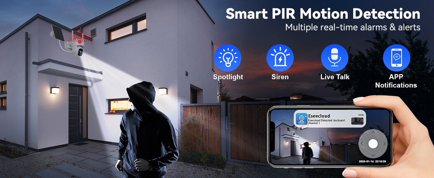 - 【Smart PIR Motion Detection, Real-time Notification Alerts & Multiple Alarms】The Solar Security Camera comes with high sensitive PIR motion sensor for smart motion detection. Once PIR is triggered the outdoor security camera wireless drives audible siren alarm & spotlight alarm to deter unwatned intruders and sends real-time phone push notificatoin alerts. To conserve battery life, the solar camera is not with auto tracking. Solar security cameras wireless outdoor built-in microphone and speaker support 2-way talk