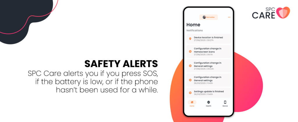 - | SOS BUTTON AND SAFETY ALERTS | The SOS button on the side allows them to call for help instantly: it sends a cycle of calls and text messages to the pre-configured emergency contacts, repeating the cycle up to three times if there is no response. Additionally, the SPC Care app gets notifications if their phone has not been used for several hours and if their battery is low. Two ways to act in time if something is not right.