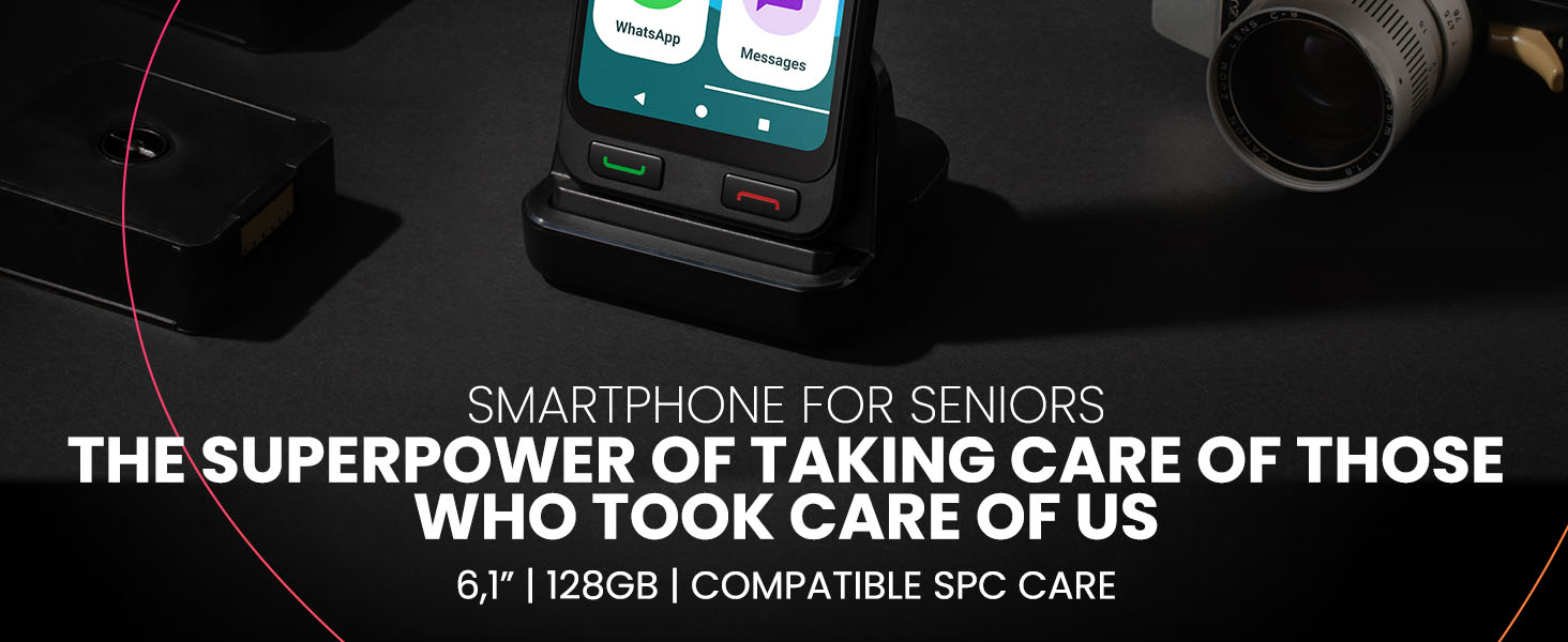 SPC Zeus 2 Pro – Senior smartphone compatible with app management and location remote | Easy Mode, physical buttons, XXL icons | 6.1” display, dual camera, 128GB | Charging base, SOS butto