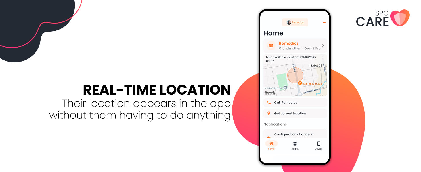 - | REAL-TIME LOCATION | Thanks to the SPC Care app, you can always know where they are. If they have gone out, if they have arrived at their appointment, or if they are still at home. A feature designed so you don't have to call every time you're worried, and they don't have to explain themselves.
