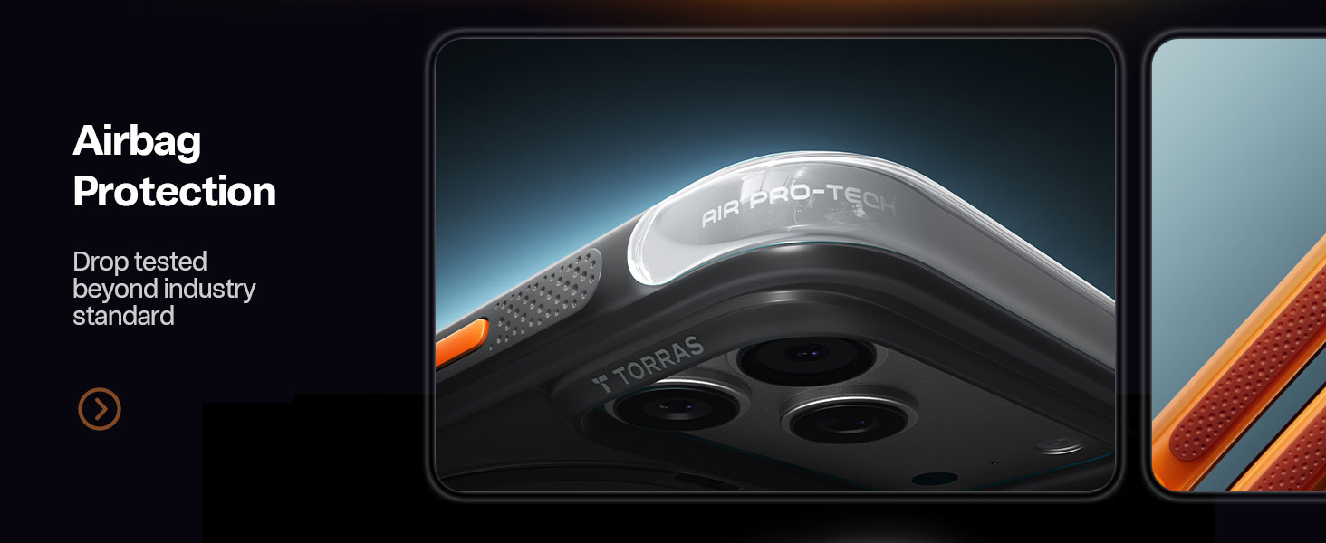 - [Dynamic Airbags Structure – Drop Protection You Can See] Weighing only 52g, this case for iPhone 17 Pro Max features TORRAS’ patented Shock-Mat technology, inspired by air-cushioned sneakers. The first sealed air cushion structure absorbs and disperses the impact – delivering a 100% rebound rate and drop protection that exceeds military-grade standards. Tested across 5,000+ real-world drops in outdoor environments, it’s built to handle the unexpected.