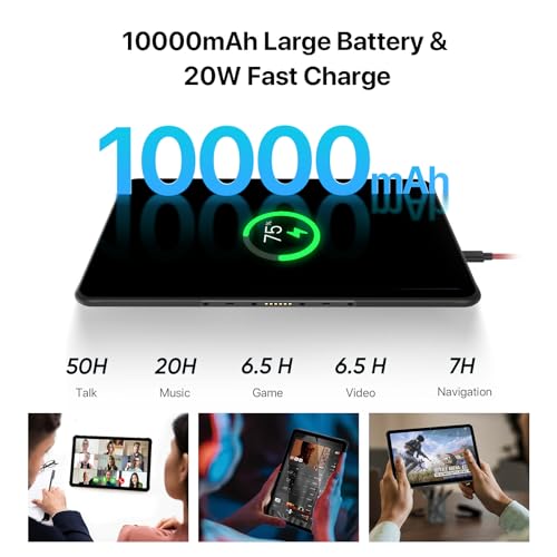 - :The nearly 12 inch tablet andriod comes with a massive 10000mAh battery paired with 20W fast charging.That means you get 50 hours of talk time, 20 hours of music playback, 6.5 hours of video game time, and 6.5 hours of video playback.