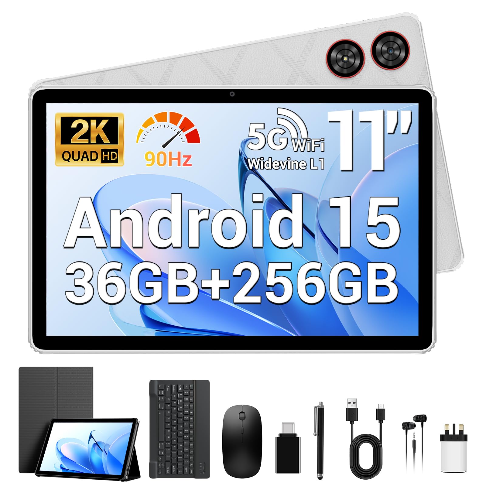 WITECOR 2025 Newest 11 inch Tablet, Aandroid 15, 36GB RAM 256GB ROM 1TB Expand, 2K IPS Screen, 5G/2.4G WiFi, Octa Core 90Hz, Widevine L1/13MP/GPS, 2 in 1 Tablets with Keyboard/Mouse/Case/Pen/Earphone