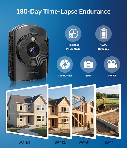 - : Equipped with 12 AA batteries (not included), it can continuously document foundation pours, framing, and exterior finishes for up to 180 days, while fitting just four batteries lets you power short‑term shoots with ease