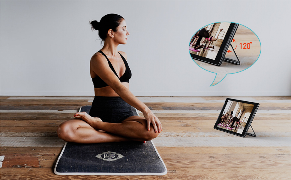 Our tablet comes with a stand that supports 0-120 degrees adjustment to meet your needs, especially for use during yoga.When you bend over or look down, you can freely adjust the angle of the tablet.