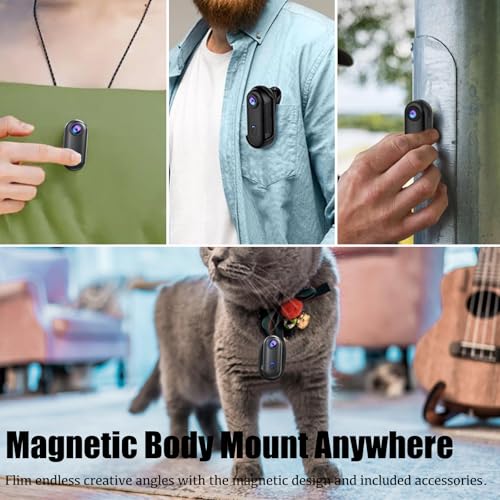 - Mount Anywhere in Seconds: With a built-in magnet, magnetic pendant, and 360° rotating back clip, you can easily mount the mini camera to your chest, collar, pocket, backpack, or any metal surface. Film from creative, flexible angles effortlessly.