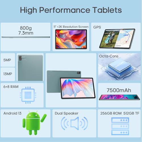 - 【Huge Capacity Storage】This 11 inch tablet pc is equipped with 14GB(6+8virtual)RAM, 256GB ROM, in addition, this android 13 tablet also supports TF/SD cards with a maximum capacity of 512GB to expand the storage space to meet your more use needs, making it easy for the tablet to switch smoothly between more apps.