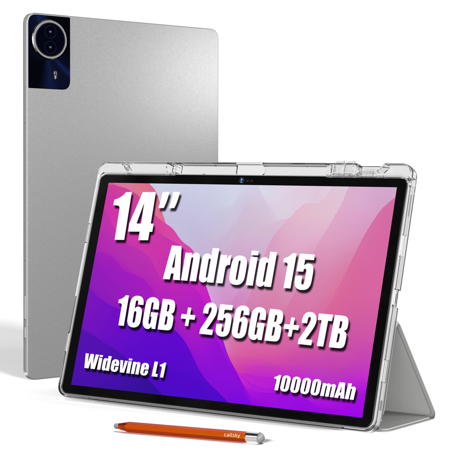 Embrace a Stunning 14-Inch View, Experience the New Era of All-in-One Tablets! The Callsky Flagship Tablet combines powerful performance, immersive audiovisuals, versatile form factors, long-lasting endurance, and smart control into one ultimate device—your ideal hub for work, study, and home entertainment. Immersive Home Theater Experience: Enjoy expansive, clear visuals with the 14-inch HD IPS display (1920×1200 resolution) featuring a professional anti-glare coating for comfortable eye protection. Quad stereo speakers deliver surround sound with rich bass, making every movie, study session, or game truly lifelike. Octa-Core Power, Effortless Fluency: Driven by the efficient Unisoc T616 Octa-Core processor (up to 2.0GHz) built on an advanced 12nm process, it ensures smooth multitasking, lag-free gaming, and seamless daily use. Paired with 16GB RAM and 256GB storage, it easily handles vast apps and files. Your Mobile Studio, Shape It Your Way: The innovative triple-folding case instantly transforms your tablet! Easily prop it in multiple angles: Stand Mode is perfect for video calls and meetings; Viewing Mode offers the ideal tilt for movies; Reading Mode adjusts to your preferred angle. One case empowers work, play, and reading with ease. Super-Long Battery Life, Unstoppable Power: The mighty octa-core performance is fueled by a massive 10,000mAh battery, keeping you powered for a full day of action. Includes an 18W fast charger for quick top-ups. Dual-band Wi-Fi ensures smooth streaming, live broadcasts, and learning even in crowded networks. More Than a Tablet—Your Smart Life Commander: With built-in GPS, it effortlessly becomes your home smart control hub, managing appliances instantly via Bluetooth 5.0, or your in-car entertainment & navigation center for enhanced travel fun. Even locate your robot vacuum—command your smart life at your fingertips. Ready to Use, Peace of Mind Included: Get a complete accessory bundle: 18W fast charger, 6ft USB-C cable, stylus (for precise writing/drawing), and the versatile triple-fold case. Equipped with an 8MP front camera (ideal for HD video calls) and 13MP rear camera (to capture life’s moments clearly), backed by a 2-Year Warranty for worry-free ownership. Choose the Callsky 14-Inch Flagship Tablet—Unlock a New Chapter of Efficiency, Entertainment & Smart Connectivity!