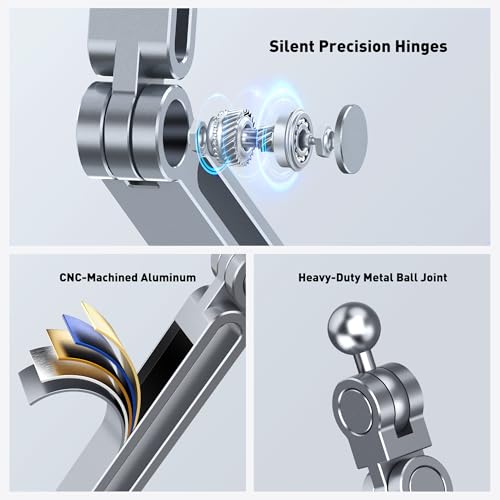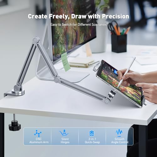 - HEAVY DUTY STABILITY & MAGNETIC POWER: Crafted from CNC-machined aluminum, this iPad holder for desk features a three-stage arm that supports up to 2.2lb / 1kg without sagging, ensuring long-lasting stability for tablets and portable monitors. The upgraded magnetic head delivers a powerful grip, keeping phones and tablets securely in place during work, drawing, or streaming. A rugged iPad clamp mount built for offices, studios, and pro users.