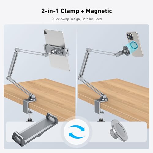 - TRUE 2-IN-1 VERSATILITY: Switch instantly between a secure clamp and a magnetic head with this 2-in-1 iPad stand for desk. The quick-swap system works with both tablets and phones: we include two magnetic rings—small size for phones, large size for tablets—ensuring seamless use with iPhone 12–16, MagSafe, non-MagSafe cases, and more.