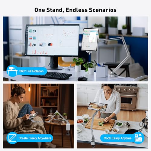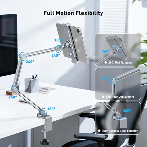 - FLEXIBLE ANGLES & PRECISE ADJUSTMENTS: This iPad desk mount offers a 25.7" reach with multiple joints: two 7.95" arms and a 6.5" center arm adjust up to 240°, plus a 180° base tilt and 360° rotation. Smooth hinges ensure portrait or landscape stability, making it the perfect tablet stand for desk for drawing, teaching, video calls, or kitchen use.