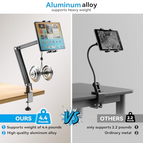 Unlike flimsy tablet desk mount (max 2.2 lbs), ours supports up to 4.4 lbs and fits devices from 4.7″ to 22″. Strong yet portable—no wobbles, just rock-solid stability.