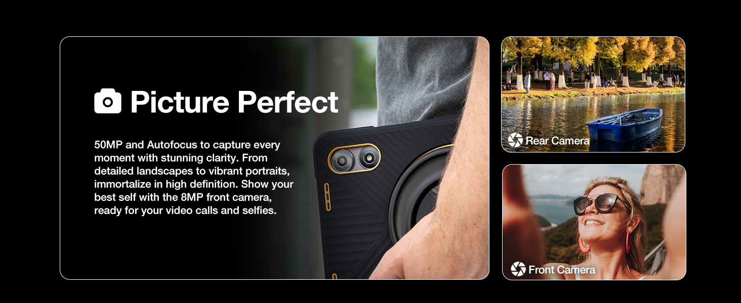 - + – With an impressive 50MP rear camera and an 8MP front camera, rugged tablet allows to take stunning photos, videos, and make crystal-clear video calls, ensuring high-quality imaging in even the toughest environments. Meanwhile, users can document work progress, take photos for inspections, and record vital information directly from the field, streamlining workflows