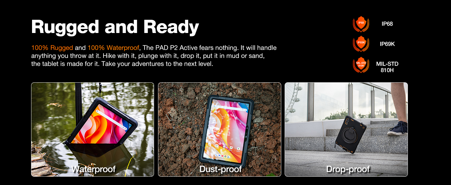 - – Built to endure the toughest environments, AGM P2 Active rugged tablet meets MIL-STD-810H military-grade standards, ensuring resistance to shocks, drops, and vibrations. With IP68 & IP69K waterproofing, it withstands high-pressure water jets and full submersion, while its dustproof, dropproof design ensures reliable performance in any harsh setting
