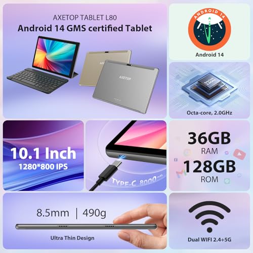 - 〖Android 14 + WideVine L1〗The AXETOP tablet is equipped with the Android 14 system and an octa-core processor, which has passed Google GMS certification and WideVine L1 certification with support for YouTube, Netflix, Instagram and TikTok to protect your privacy and security when browsing the web and watching FHD videos. Millions of applications can be accessed via the Play Store. This 10-inch 5G WiFi tablet will bring great convenience to your entertainment and work.