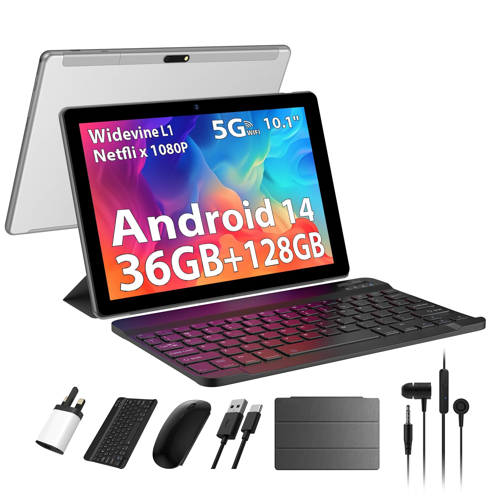 AXETOP 10 Inch Tablet Android 14,36GB RAM+128GB ROM(TF 1TB), Octa Core, 2.0 GHz,5G WiFi, Widevine L1 | Google GMS | 8000mAh | Bluetooth 5.0 | 8MP+5MP | Tablet with Keyboard, Mouse, Case, Stylus – Gray