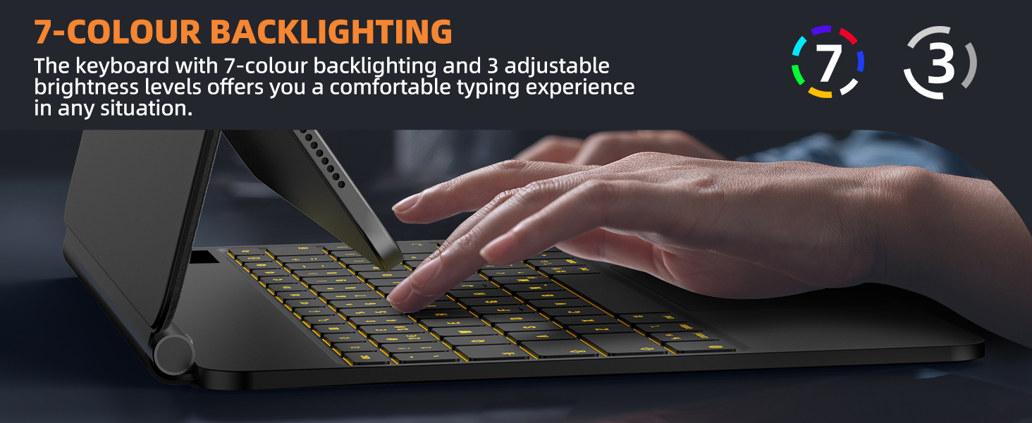 - 7 Colours LED Backlit Keyboard: For ipad pro 12.9 keyboard come with 7-colour backlighting and 3 adjustable brightness levels offers you a comfortable typing experience in any situation.