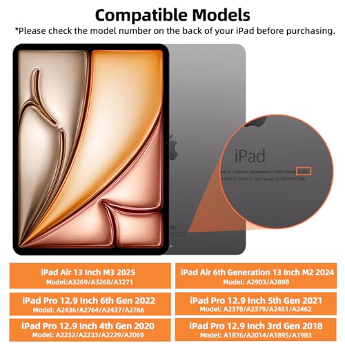 - Applicable Models: Bettdow for ipad keyboard case is compatible with New iPad Air 13 Inch M3 2025 (A3269,A3268,A3271), iPad Air 6th Generation 13 inch M2 2024 (Model:A2898,A2899,A2900), iPad Pro 12.9 6th Gen 2022 (Model:A2436,A2764,A2437,A2766), iPad Pro 12.9 5th Gen 2021 (Model:A2378,A2461,A2379,A2462), iPad Pro 12.9 4th Gen 2020 (Model:A2229,A2069,A2232,A2233), iPad Pro 12.9 3rd Gen 2018 (Model:A1876,A2014,A1895,A1983). Please check your iPad model before purchasing.