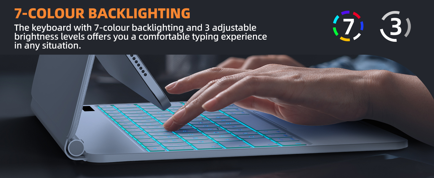 - 7 Colours LED Backlit Keyboard: For ipad pro 12.9 keyboard come with 7-colour backlighting and 3 adjustable brightness levels offers you a comfortable typing experience in any situation.