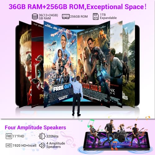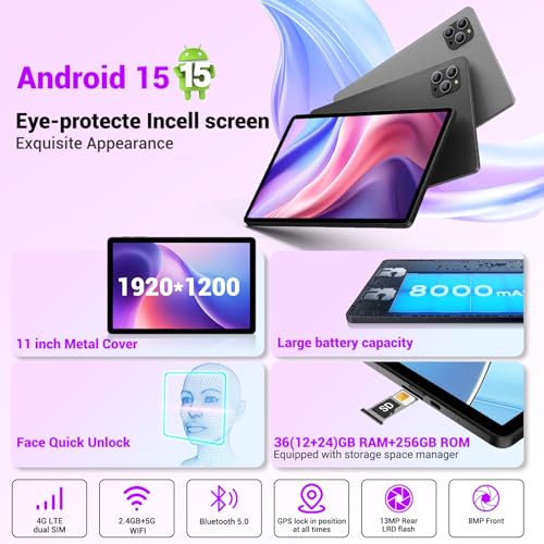 DEEMWOLF Tablet 11 inch Android 15 Tablet WiFi 5G,Octa-Core/36GB RAM+256GB ROM (TF 1TB)/8000mAh/20W/Android Tablets/13+8MP/Face ID/TÜV/GMS/BT5.0/GPS,Black