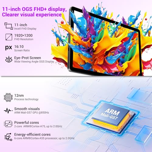 - 11 inch full HD display+Widevine L1+Netflix 1080P An 11 inch tablet certified by Widevine L1, playing Netflix, YouTube, HBO, and Prime videos in ultra-high definition format, enjoying bright colors and clear details. With a screen resolution of 1920 * 1200, 120Hz high refresh rate, and a screen to body ratio of up to 93%, it provides a touch experience with an ultra wide viewing angle T Ü V blue light technology can automatically adjust brightness to protect vision during long-term use Our self-developed AI noise reduction technology filters typical environmental sounds, allowing you to enjoy an immersive visual experience while watching movies or playing games.