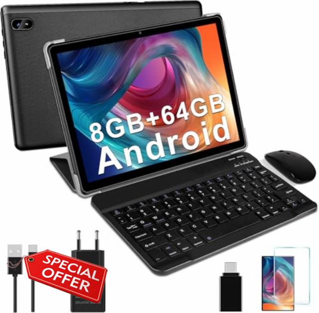 DMOAO Tablet Android 10 inch with 5G WiFi, 8GB RAM + 64GB ROM (TF 1TB), Octa-Core, BT 5.0, HD 1280 * 800 IPS, 6000 mAh, Tablet with Keyboard + Mouse, Black