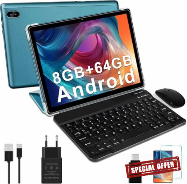 DMOAO Tablet Android 10 inch with 5G WiFi, 8GB RAM + 64GB ROM (TF 1TB), Octa-Core, BT 5.0, HD 1280 * 800 IPS, 6000 mAh, Tablet with Keyboard + Mouse, Blue