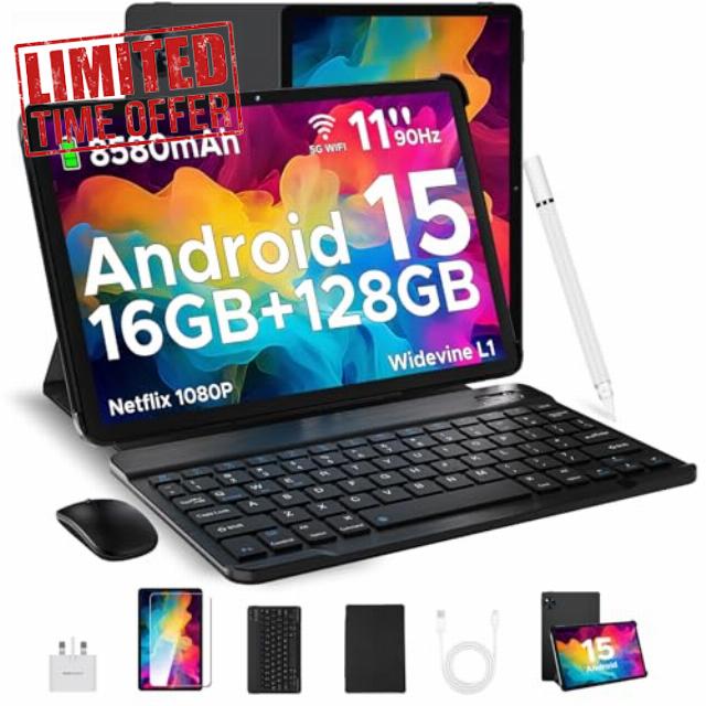 DOOGEE U11 Android 15 Tablets 11 Inch – 2025 Newest Tablet 16GB+128GB/2TB Octa Core, 90 Hz Display, 8580mAh, Android Tablets, 5G WiFi,13MP+5MP,Tablet with Keyboard & Mouse&Case-Black