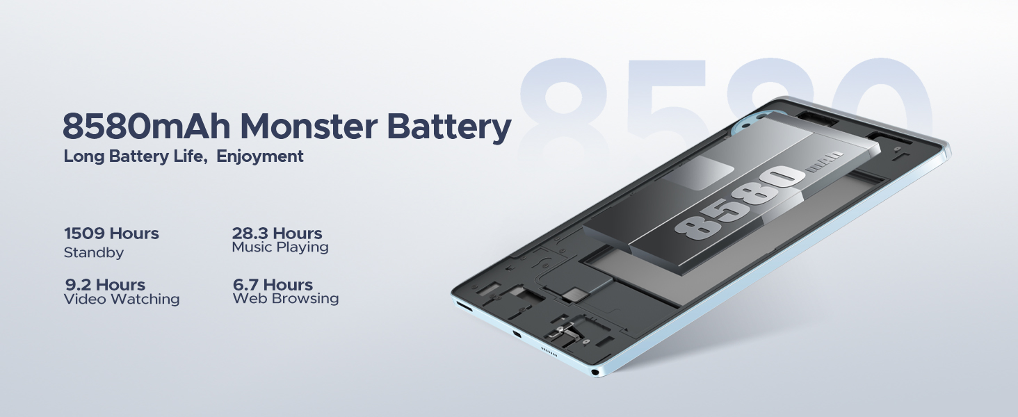 - 【8580mAh Large Battery 】 Android 15 Tablets 11 inch with 8580mAh large battery can easily work or play for a whole day! DOOGEE U11 tablet offers up to 11 hours of video playback, 26 hours of music enjoyment, and 8 hours of gaming. Android tablet has plenty of power to make battery anxiety a thing of the past.