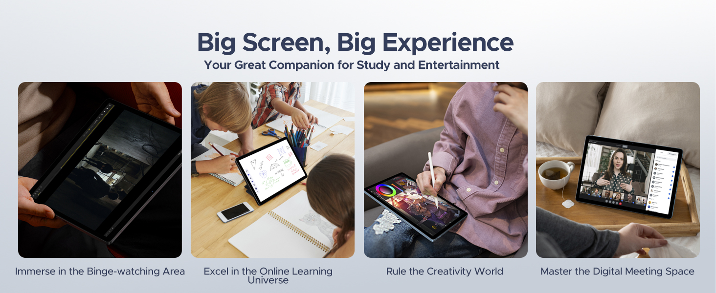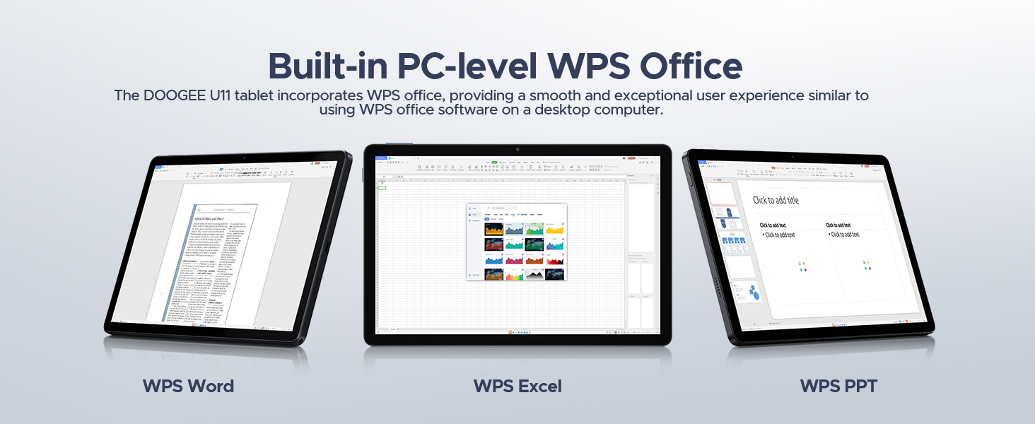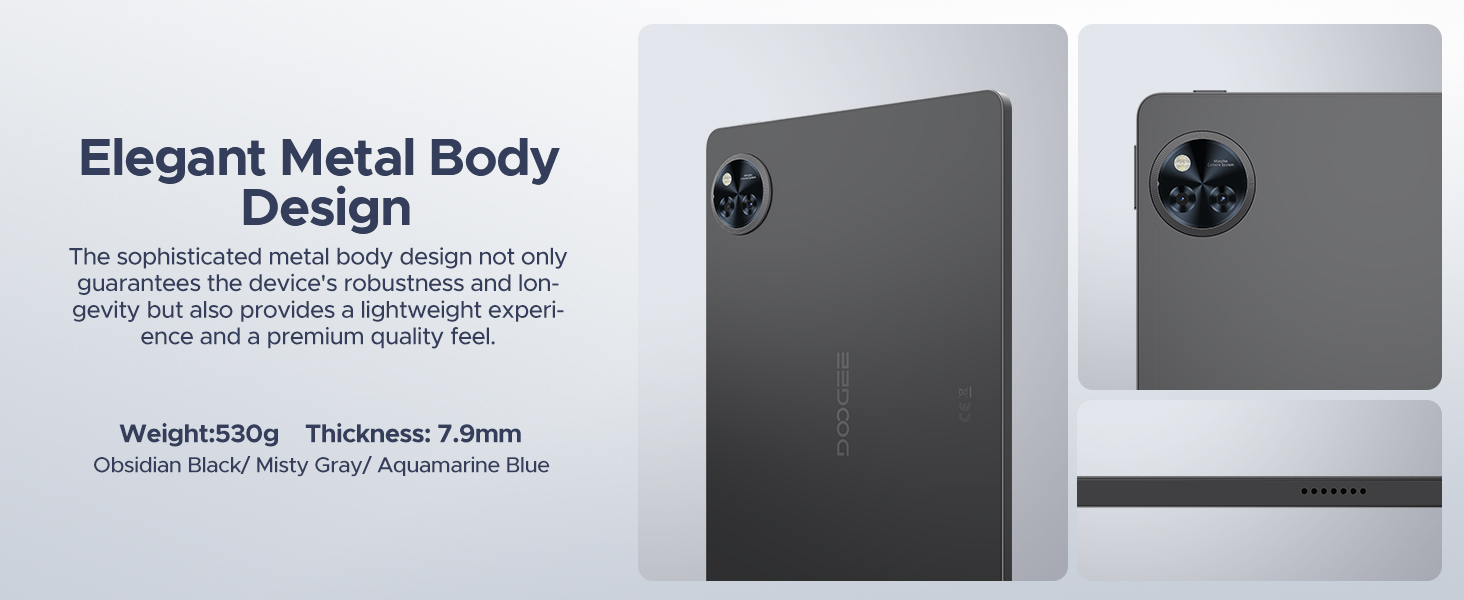 - 【Ultra-Slim Body with Elegant Metal Design】 The DOOGEE U11 Android 15 tablet features an integrated metallic back cover, weighing just 540g and measuring only 7.9mm in thickness. Its ultra-slim body and exquisite design seamlessly blend style with functionality, redefining your expectations of a tablet.Thanks to its lightweight and compact form, the DOOGEE U11 Tablet is perfect for various scenarios, including work, study, outdoor activities, and sports. This tablet fits effortlessly into your daily routine, catering to diverse needs.