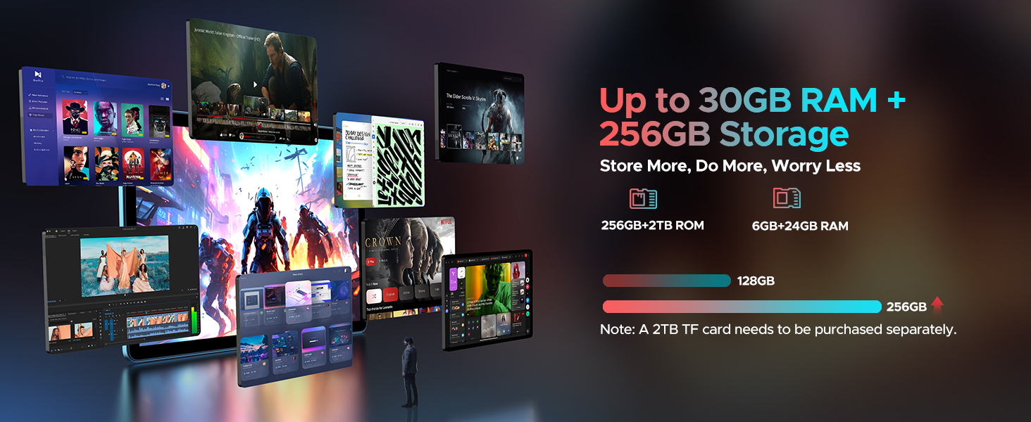 - 【30(6+24)GB RAM+256 GB ROM+2 TB Expansion】: DOOGEE U11 Pro android 16 tablet comes with a powerful combination of 30GB RAM (6GB+24G8) and 256GB ROM storage. Micro SD/ TF memory expansion (20GB-2TB) is supported, and this memory can be set as extra storage or portable storage for the tablet. The tablet operates seamlessly, whether you are using multiple apps at the same time or running games, and the newly introduced Mlemory Manager offers suggestions for clearing space to free up room on the tablet.