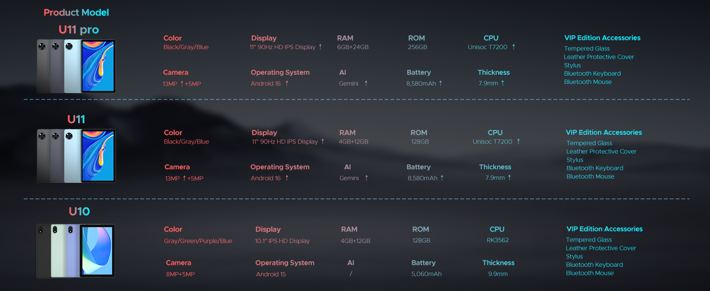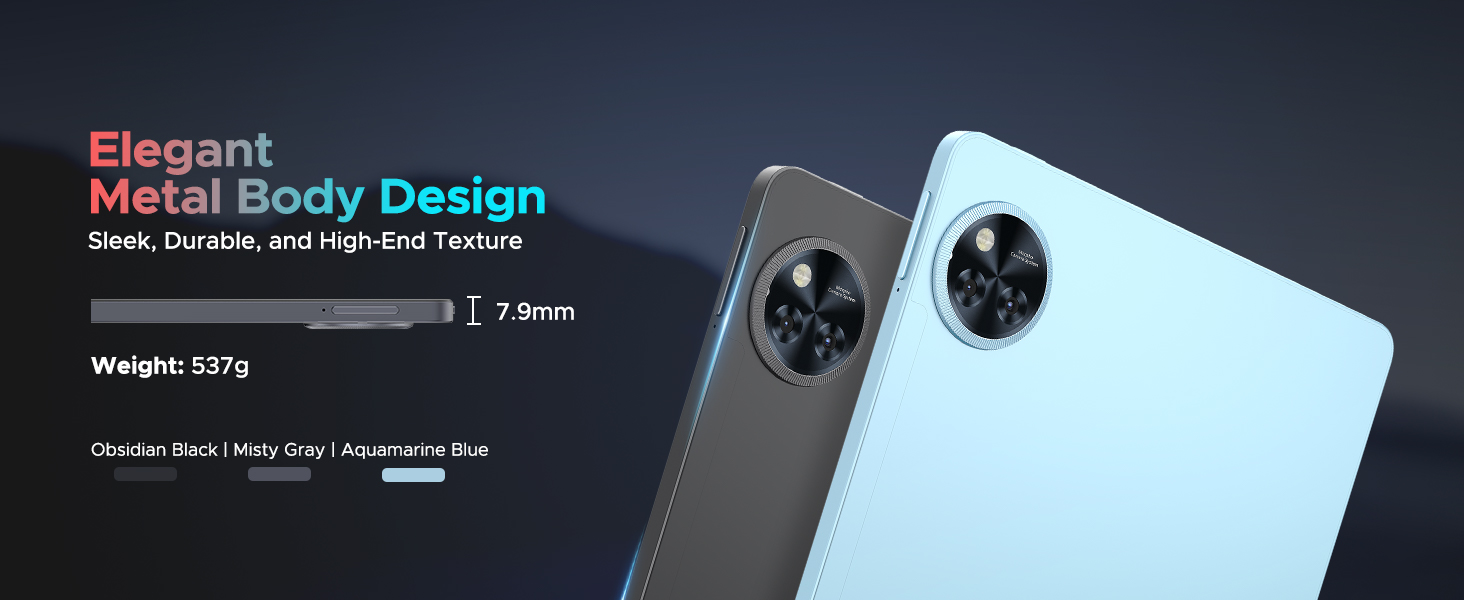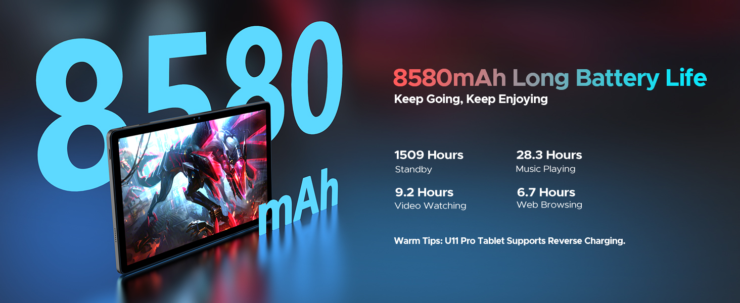 - 【8580mAh Battery & 7.9mm Metal Body】: This android 16 Tablets 11 inch with 8580mAh large battery can easily work or play for a whole day, offers up to 11 hours of video playback, 26 hours of music enjoyment, and 8 hours of gaming. Support OTG reverse charging. The doogee U11 Pro boasts a sleek metallic back cover, weighing only 540g and measuring 7.9mm thick. With a back cover metal design, curved edges and a gentle matting process, U11 gaming tablet offers a soft feel and premium look.