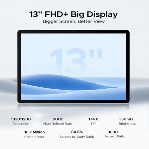 - ✈️【13 inch FHD+ & 90Hz Display】Immerse yourself in the stunning 13-inch FHD+ display of this DOOGEE U13 Android 16 tablet. With a silky 90Hz refresh rate and an expansive 84.6% screen-to-body ratio, every scene comes to life with remarkable smoothness and vibrant colours. Perfect for reviewing spreadsheets, reading, or watching films, this 13 inch tablet also enables easy split-screen multitasking, making it your all-in-one portable hub for both productivity and entertainment.