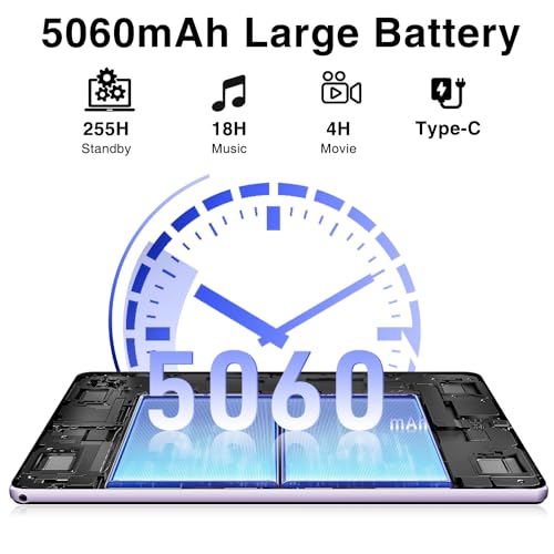 - 【5060 mAh Battery】Tablets 10 inch android with 5060mAh large battery can easily work or play for a whole day! It can stand by for more than 255 hours. The Andriod tablet is equipped with a separate Type-c+3.5 mm headphone jack. It supports wireless screen casting and easily connects to a large TV.
