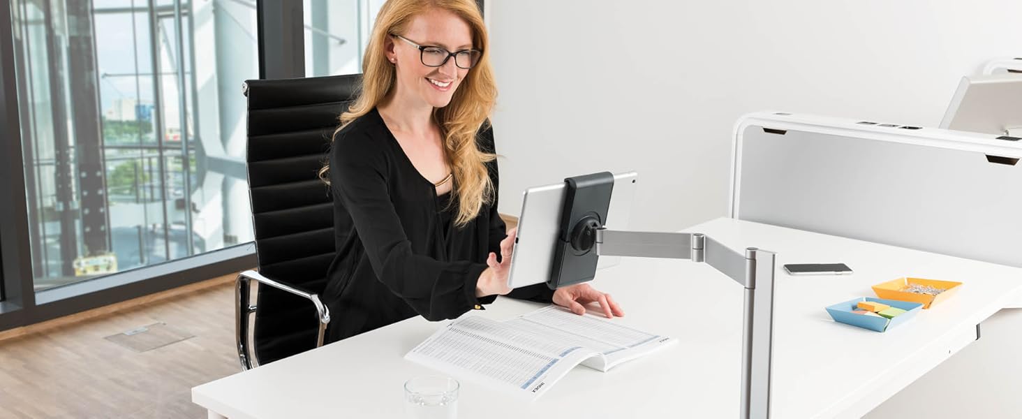 - MODERN DESIGN – A German-designed foldable tablet holder that perfectly complements the contemporary office or trade fair and is great for comfortable viewing at home in the kitchen or bedroom