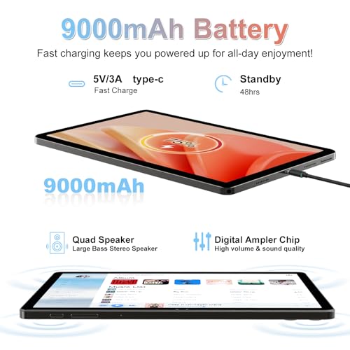 - 9000mAh Large Battery with Fast Charge: The 2-in-1 tablet has a significant 9000mAh battery and provides impressive durability for all your needs. Enjoy up to 6 hours of video playback, 10 hours of music and 15 hours of e-book reading on a single charge. The 5V/3A Type C fast charge ensures fast power on so you can connect and entertain all day with minimal downtime