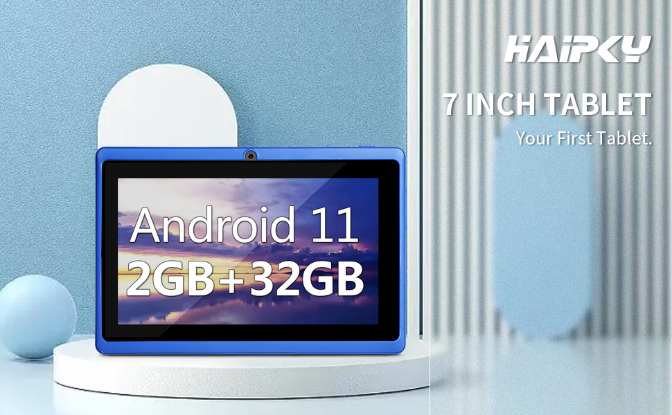 - haipky 7 Inch Android 11 Tablet PC, 2GB RAM+32GB ROM, Quad Core, Dual Cameras, 1024×600 HD Screen, WiFi, Bluetooth, GMS, Gift for Adult & Kids Blue