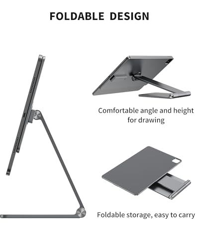 - Sturdy Aircraft-Grade Aluminum Alloy Build – Crafted from premium aluminum alloy, this portable stand combines strength and style. Through CNC high-speed machining, sandblasting, and anodic oxidation treatment, it delivers a frosted texture and durable finish that perfectly complements your iPad Pro. The thicker, larger base and optimized center of gravity ensure exceptional stability—no shaking, no slipping—while keeping the stand lightweight and easy to use.