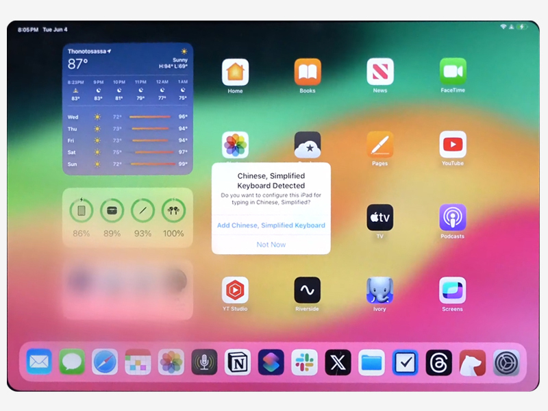 This stand is wirelessly charged via the Magic Keyboard pin smart connector. Upon first use with the iPad, you may receive a popup notification for a Chinese keyboard. This is completely normal. You can dismiss it, and the prompt won't appear again.