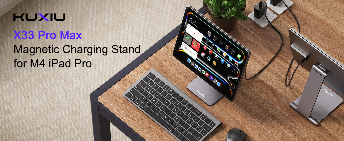 KU XIU X33 Pro Max Magnetic Wireless Charging Stand for iPad Pro 11″ M4 (2024) Only, Foldable Aluminum Alloy Tablet iPad Holder Mount for Desk, 360° Adjustable Tablet Stand with 1M USB C Cable